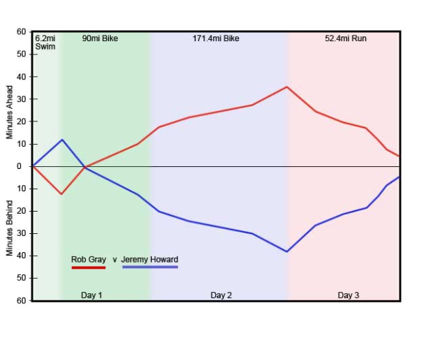 When healthy, Howard and Gray are evenly matched with very different triathletic profiles. Howard is a superb swimmer, Gray a good one. Gray is a superior cyclist, Howard is decent but insecure on descents. Howard is a superb runner while Gray has to work hard to defend what he earns on the bike.