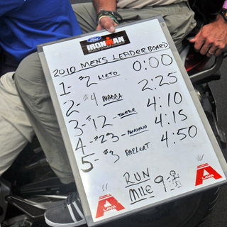 [At Mile 9 of the run Macca was 2:25 behind Chris Lieto, who was fading. Raelert was 4:50 down to Lieto – 2:25 behind Macca]