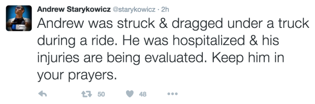 Ironman & Ironman 70.3 champion and über cyclist Andrew Starykowicz was hit and dragged under by a van Saturday morning during a training ride. He was hospitalized and his injuries evaluated, but has since been released. We have reached out to Andrew and his wife Jill but understandably no response yet. We will continue to keep you all updated as we learn more. Please keep Andrew in your thoughts and stay safe out there everyone.