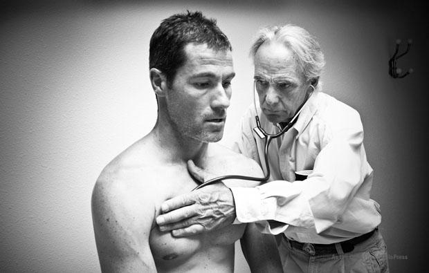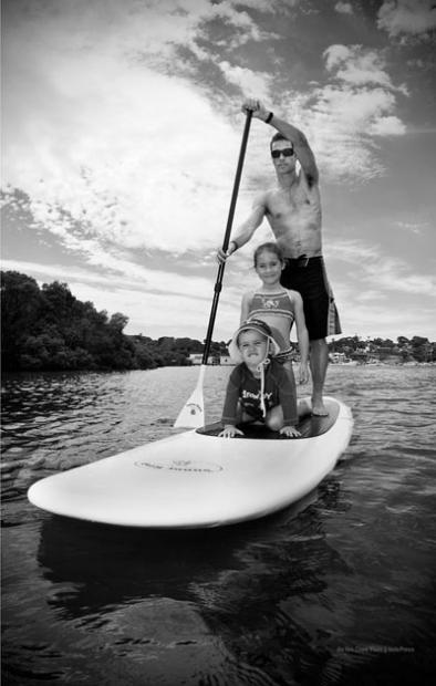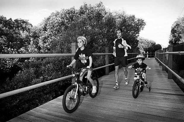 Forgive this long list, but there are so many photographs that strike this reviewer as original and powerful. I particularly like Crowie with flyaway dumbbells on the Swiss ball (p. 4), standup paddling with his children (p. 12), the training ride from Cronulla to Wollongong (pp.16-17), the sweaty intensity of his indoor bike workout (p.18) , a solitary run from Cronulla to Boat Harbour (pp.20-21), striking a yoga pose on the bottom of an Abu Dhabi pool (p. vii), a shot of his doctor checking his lungs during the infection (pp. 43-44), a classic swim exit (pp. 52-53) and run shot (pp.54-55) at Alcatraz, a David Lean-style wide angle style shot of a training run in Boulder (pp. 76-77), a unique shot of the Las Vegas medal ceremony (pp.84-85), a panorama of Crowie running the Energy lab at Kona (pp. 112-113), a shot of a tapped out Alexander in the Kona medical tent (p. 120), a shot with Crowie and Dave Scott (p. 134), a close-up beauty of Crowie swimming with the sparkling water trailing from his hand pp. 140-141).