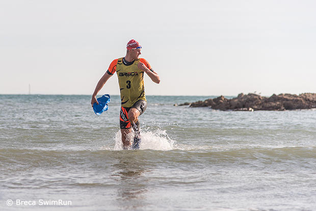 Professional triathlete Daniel Halksworth leads teammate Oliver Turner out of the water in this section. And this team was at the front most of the day.