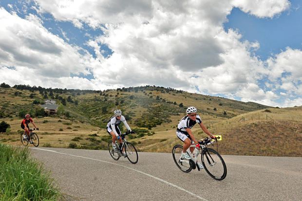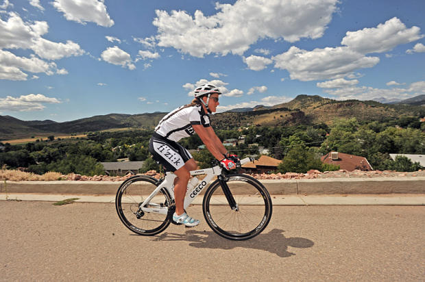 Belinda buckles her chin strap preparing for a 65 km ride from Lyons to Left Hand Canyon Rd. and out to Hygiene on Wednesday August 19 at 2 PM.