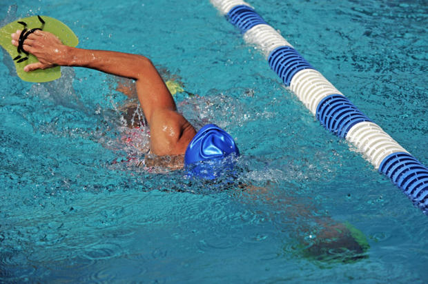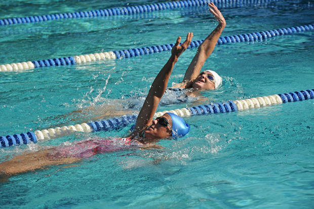 Good friends Belinda Granger and Joanna Lawn look like synchronized swimmers while completing a backstroke set.
