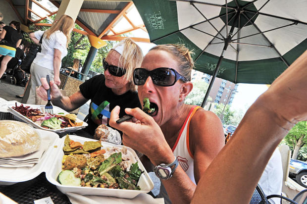 After using a couple thousand calories earlier in the day, Belinda Granger bites into a satisfying mouthful at one of the Whole Foods outdoor tables.