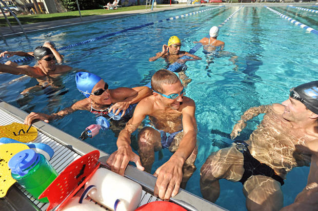Wednesday August 19, 10:30 AM. Boulder’s Spruce Avenue Pool swim workout. There’s a lot of camaraderie among friends and fellow pros in a 90-minute workout. Left to right: Laura Bennett (obscured), Justin Daerr, Belinda Granger, Armando, Justin Granger, Gordo Byrn.