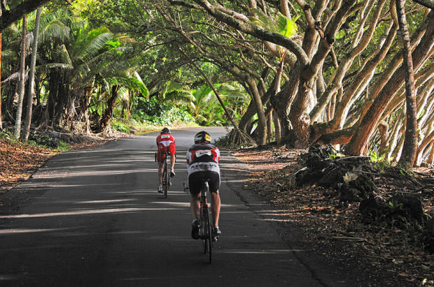 Leaders rider under tropical canopies on Day 2 of Ultraman.