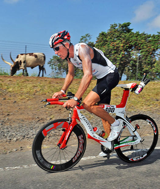 Slovenia’s Miro Kregar stayed within striking distance on the bike – watched here by a Hawaiian longhorn – and then attacked on the run for his second 2nd place finish at Ultraman.