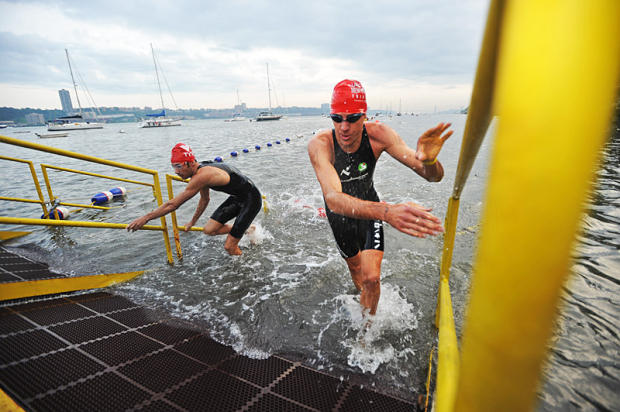 Emerging from the Hudson River swim at the New York City Triathlon.