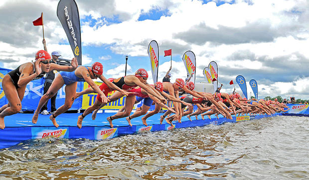 The women’s elite wave hits the water from a pontoon erected on the Potomac for the historic ITU Dextro Energy World Championship Series event in Washington DC.