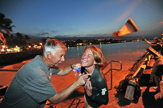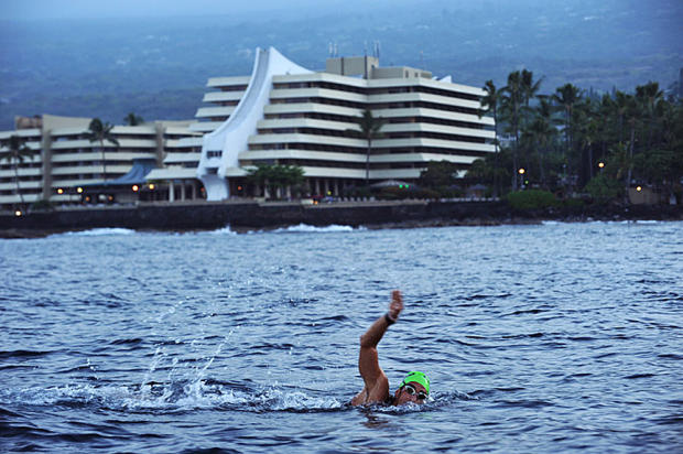 Ultraman swimmer passes Royal Kona Resort at dawn.
