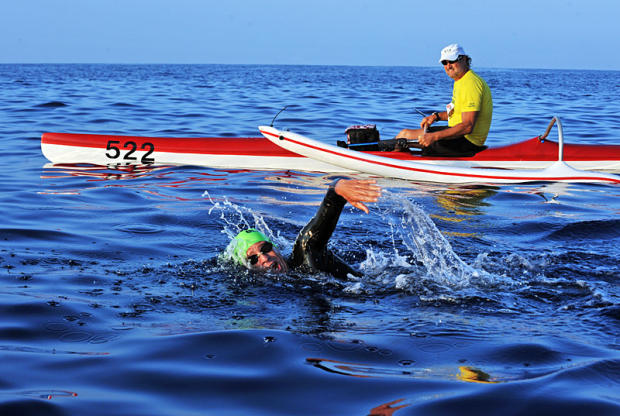 Traffic cops on surfboards help keep the swimmers at Ironman Hawaii on course.
