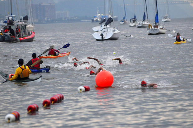Heading for swim exit at the New York City Triathlon.