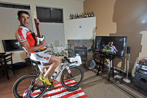 Timothy O’Donnell, 2009 ITU long distance World Champion, 2010 Ironman 70.3 World Championship bronze medalist, playing Guitar Hero during a winter indoor workout in Boulder.