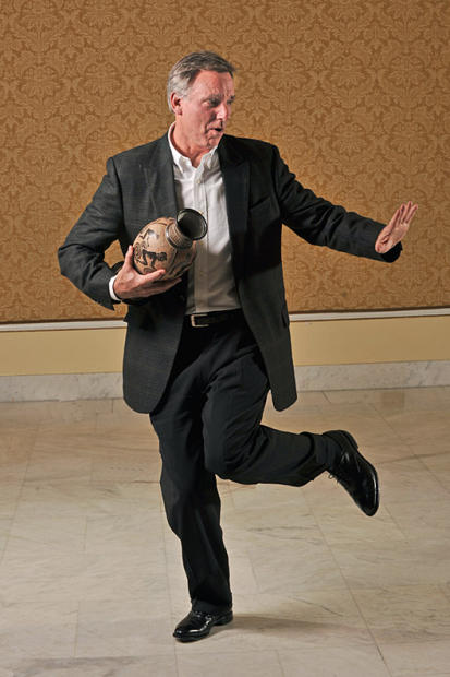 USAT 2010 Hall of Fame inductee Carl Thomas strikes a Heisman pose with his stylized Greek triathlon vase.