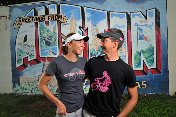 Michael Lovato standing outside Chuy's, Austin’s famous Tex-Mex diner, after a long ride.