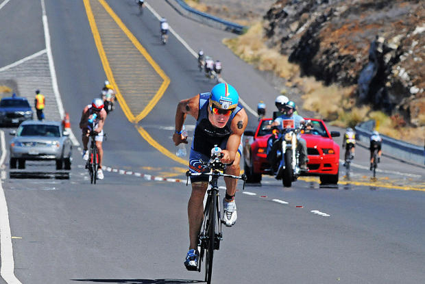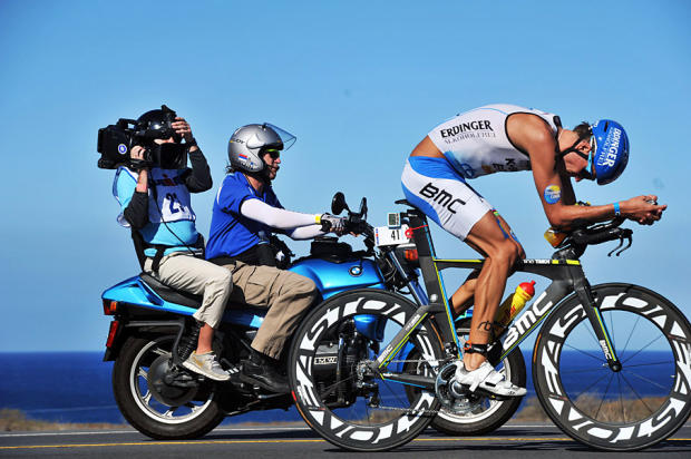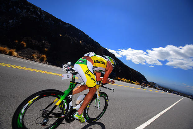 Sebastian Kienle chases Marino Vanhoenacker at Mile 85 of the bike in Kona.