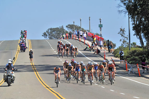 Elite women ride at ITU World Triathlon Series San Diego event.