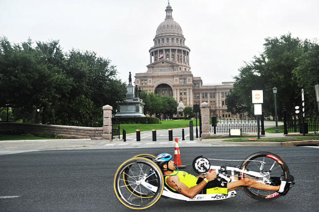 A physically challenged CapTex competitor rides past the Texas state capitol building.