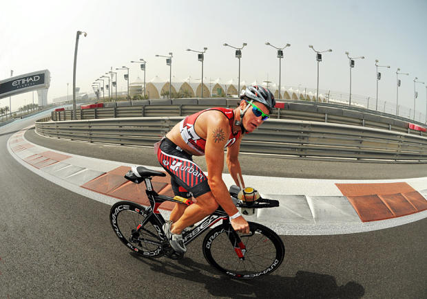 Leon Griffin rides the Yas Marina circuit on the bike leg at Abu Dhabi.