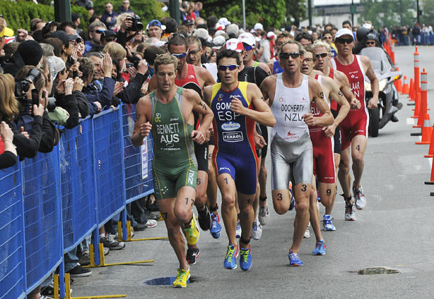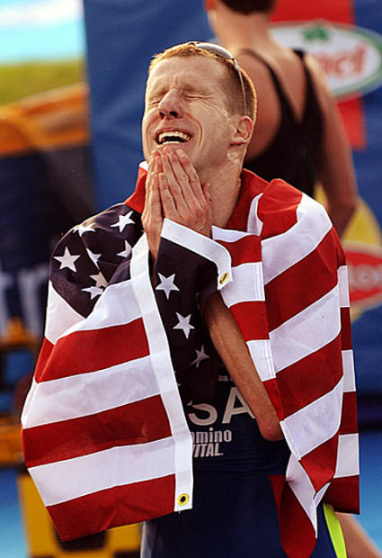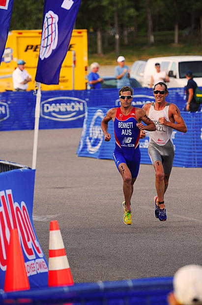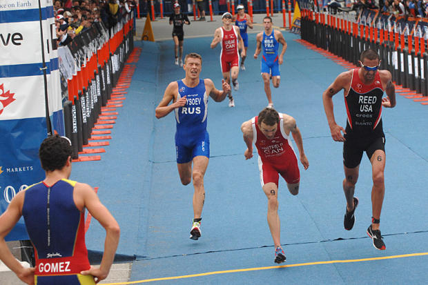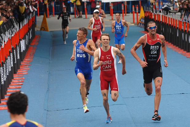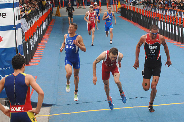 Six-foot 5-inch Matt Reed in a duel for 5th place with home country favorite Simon Whitfield.