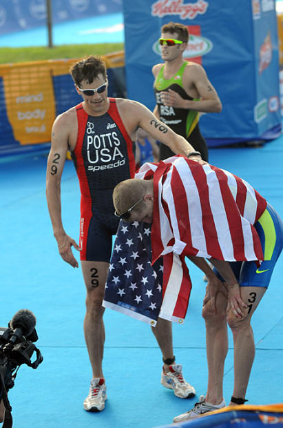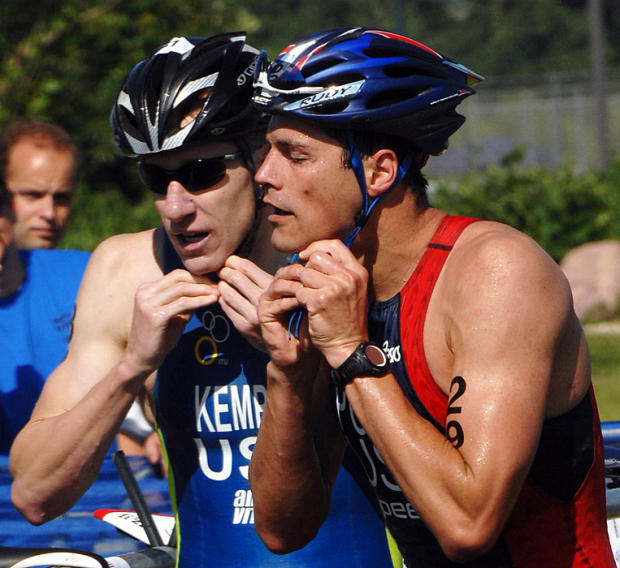 In triathlon’s version of a Texas Death Cage Wrestling match, Hunter Kemper and Andy Potts hit T1 in a tie, clicking in helmet straps in high-tension unison.