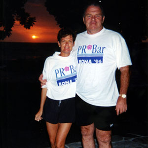 Bill's not quite as big as he used to be, as the photo adjacent (with wife Sheri) demonstrates, versus the photo just below of Bill and Sheri a decade and a half ago, in Kona, during PR*Bar's heyday. Bill has slimmed down, and healthwise the interim years have treated him well—rather, he's treated himself well.