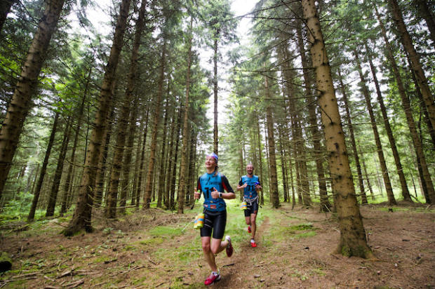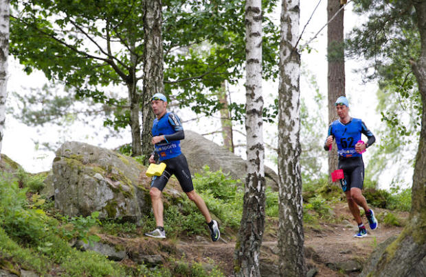 120 teams competed around the perimeter of a large lake in town and the surrounding trails. Altogether roughly 30 kilometers of running over 14 separate stages and five kilometers of swimming over 13 stages.