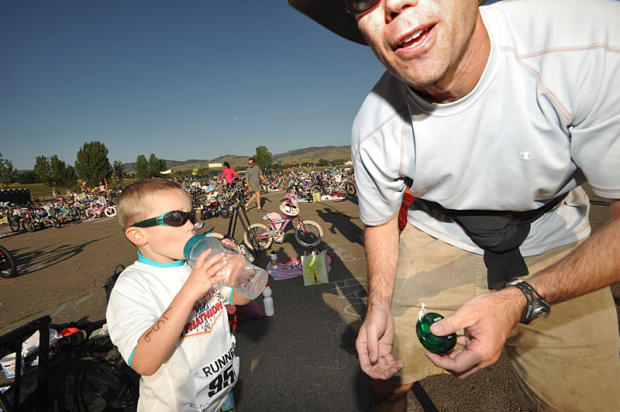 Dad makes sure his son rehydrates after the race.