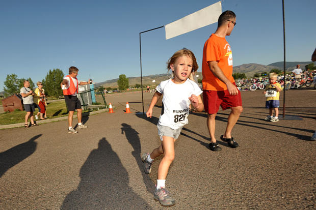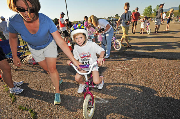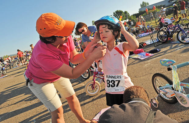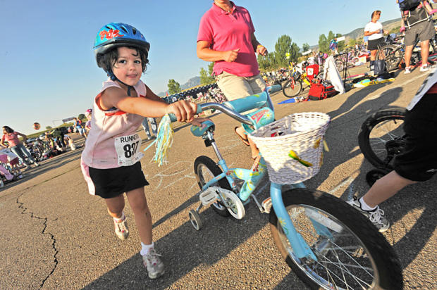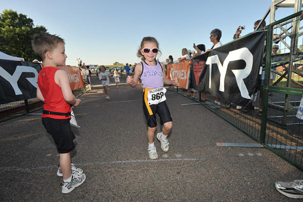 Little kids as young as three years old wear floaties on their arms and get to walk through 40 yards of shallow water for the swim. With anxious parents hovering nearby in case of a fall, they dry off, put on helmets, and get on everything from Princess style bikes with glittery pink tassels and training wheels to tricycles and round a parking lot. The run for these pre-kindergarteners consists of a 60-yard out and back holding on to a parent’s hand