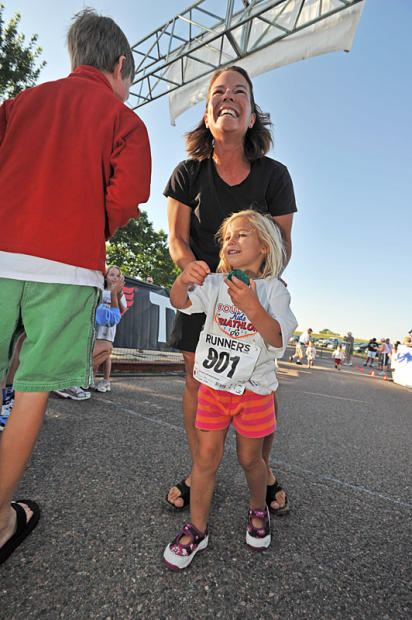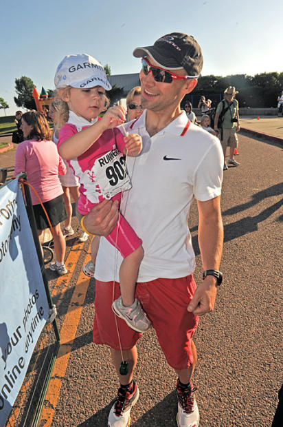 Here Boulder Sports Medicine exec and coach Neal Henderson holds his daughter, who raced the triathlon but was still figuring out how to work her finisher’s yo-yo.