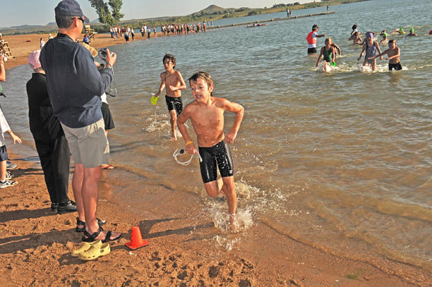 The 13- and 14-year-old swim wave hits the Boulder Reservoir water with panache.