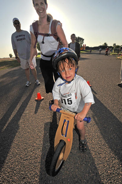 Breaking out of the gate, a 3-year-old rides her tricycle out of T1.