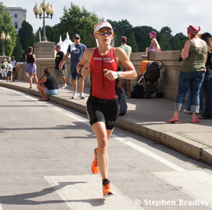 With a new bike position in place, Warriner pulled away from Major and Jones and led the race until T2. Heather Jackson had exited the swim in 12th position and more than 5 minutes behind the leaders, but she used her bike prowess for a 2:29:53 split that allowed her to enter T2 back in contention. Kate Major also had a solid performance and started the run about a minute behind Warriner.