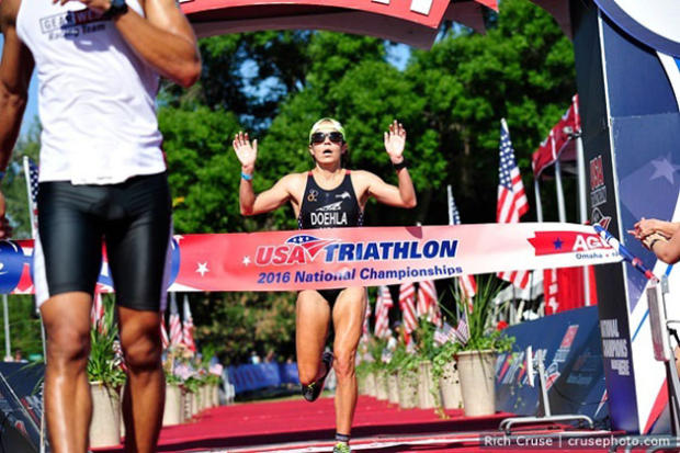 Doehla won the women's overall and 30-34 age group with a time of 2:09:24. Doehla, a former professional runner, won in her first full year as a triathlete.
