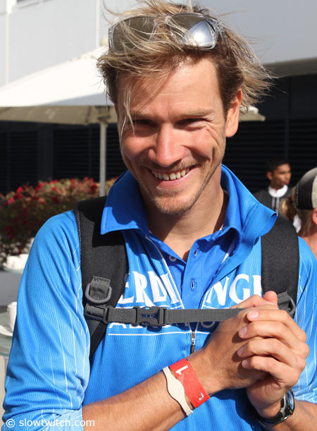 Michael Raelert carries the burden of the #1 bib but seemed relaxed. He also showed great respect for Javier Gomez and Tim Reed.
