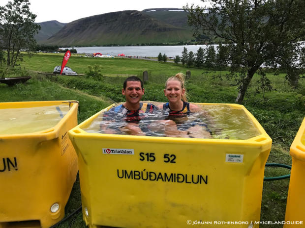 Winner, winner, chicken dinner! Metzler and Seymour, who are a couple in addition to both being 2017 Challenge Iceland champions, enjoy a warm soak together. All smiles after a very tough day that ended with great wins for both of them.