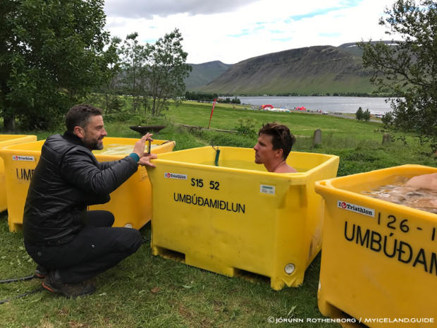 Race director Pétur Einarsson broadcast onto Facebook Live the whole weekend and here does an interview with an athlete in a tub.