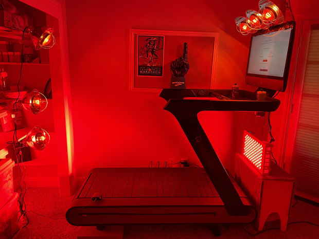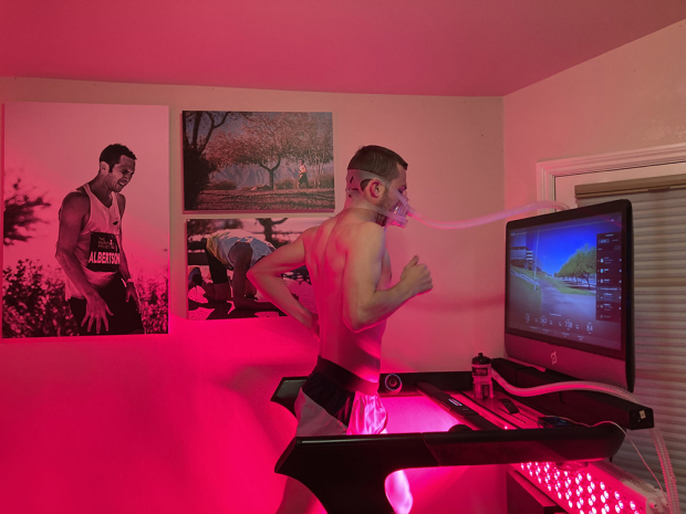 CJ: My treadmill set up is pretty great. I have a soundbar and subwoofer that syncs to the Peloton tread. Peloton usually has a great playlist for both their instructor classes and scenic rides- so the overall sound experience is motivating. I also have a 65-inch TV in the room that I sometimes broadcast Zwift too; or I just watch TV. I then have a red light panels in both the front and back of my treadmill and also have heat lamps if I want to run in hot conditions. I have a shop fan which is a necessity- otherwise the treadmill belt would be soaked and too slippery to run on. Lastly, if I’m doing an easy run, I will usually have my Higher Peak altitude generator and mask set to 10,000- 16,000ft. Running at 16,000 ft is pretty terrible, but I’m hoping it will lead to some improvements.