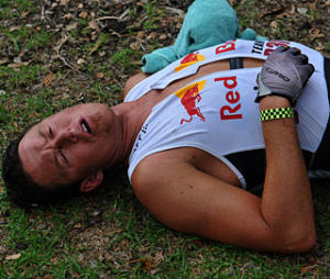Jonas Colting has a bronze and a silver at the ITU long course world championships and Ultraman world titles in 2004 and 2007. Despite his 10 minute lead over Mike LeRoux of Australia, then 37-year-old Swede looked nothing like a breezy winner at the end of his ride. "This was the nastiest day ever in my racing career," said Colting as he tried to stretch the cramps out of his painful legs at the stage finish. "I had a hard time keeping my bike upright," he said. "There were parts on the final 30 miles where I usually can rest but today I had to hold on for dear life."