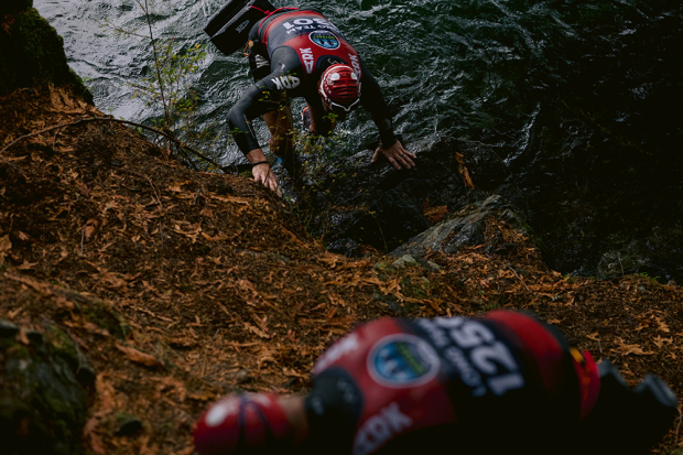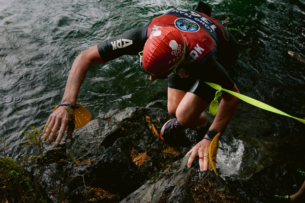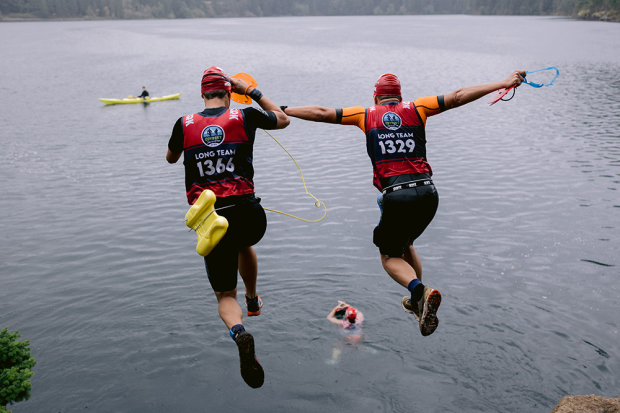 Most athletes had fun with this roughly 10 foot cliff jump, but there was also an option to get to to the water without jumping. Julien Ravinel and Frederick Kim of team French Fries and Kimchi jumped gracefully in on the way to 11th place overall. Meanwhile a solo division athlete below got ready to swim on.