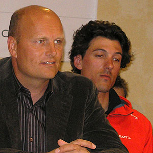 Bjarne Riis (pictured, with Fabian Cancellara at his elbow) said this was the best Winter camp his team had ever had. Better than Solvang? Yes. Better than the South of France and Mallorca and all of that? Yes, the best. Very good climbs. And the weather. No shit. Seventy-five and eighty degrees every day in late Jan and early Feb. This is one righteous example of a payoff of Global Warming Red Staters talk about over in the Lavender Room.