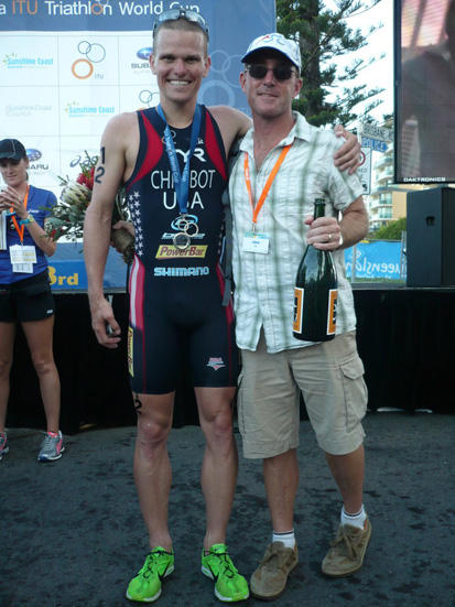 A happy Matt Chrabot with Coach Daz after his second place at the ITU Moololaba World Cup.
