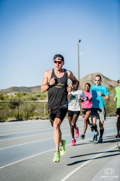 At a fairly early morning track workout at the Pima Community Track, the guy in the bleachers is my mentor and co-coach, 2000 Olympian Ryan Bolton. Ryan is explaining the workout here to a number of his athletes I know from Training Peaks.