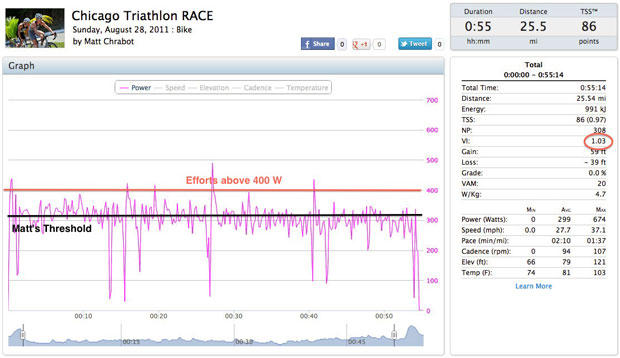 A much more even effort in Chicago on his Blue Triad SL triathlon bike, with about 3% more power used total, but only 5 efforts over 400 watts.