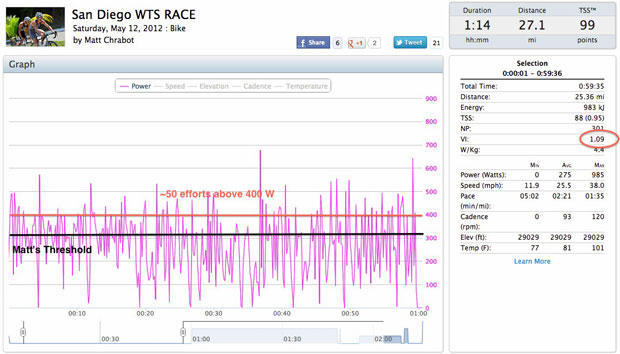 The power spikes and surges are quite obvious on this ITU San Diego WTS file of Matt Chrabot. Chrabot went above 400 watts 50 times aboard his Blue AC1 SL road bike.