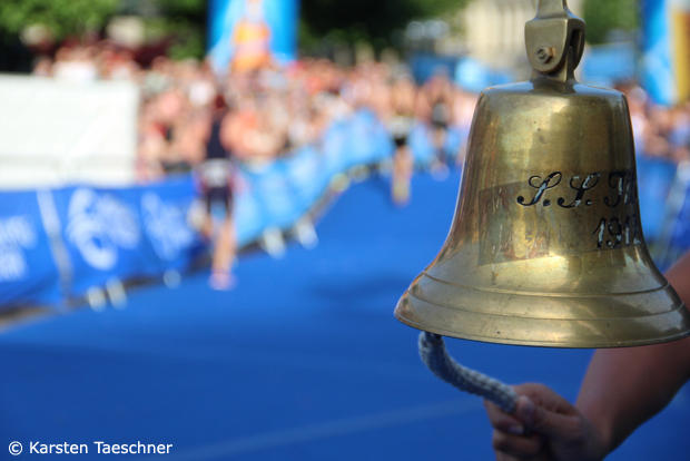 Lagerstrom surrounded by German triathlon fans in pursuit of the front group.