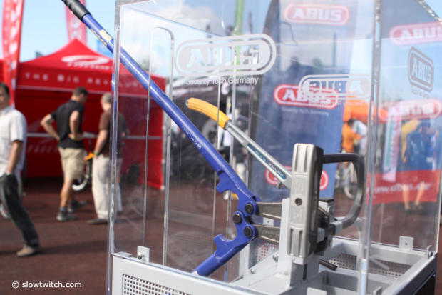 Abus is known for their locks and here folks could try some big bolt cutters on an Abus and an unidentified competitors product.
