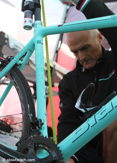 Hard at work in the Bianchi booth to prepare and set up the next bike for a demo ride.