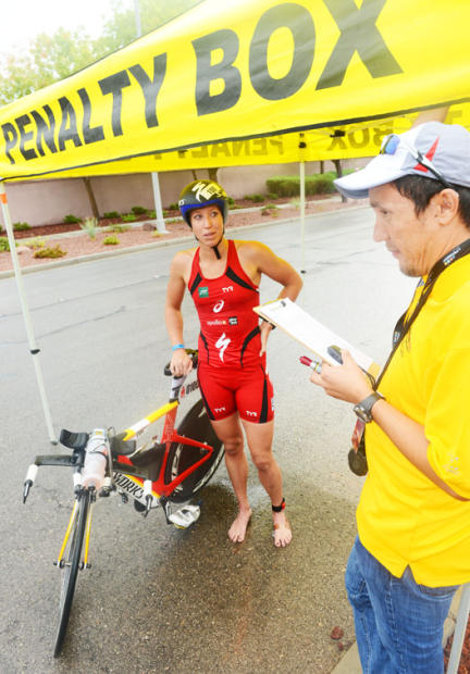 2012 Olympic runner up Lisa Norden takes her 4-minute bike leg penalty at Las Vegas with good grace.