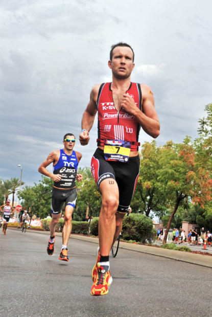 Joe Gambles fights off Andy Potts at the Ironman 70.3 World Championship in Las Vegas.